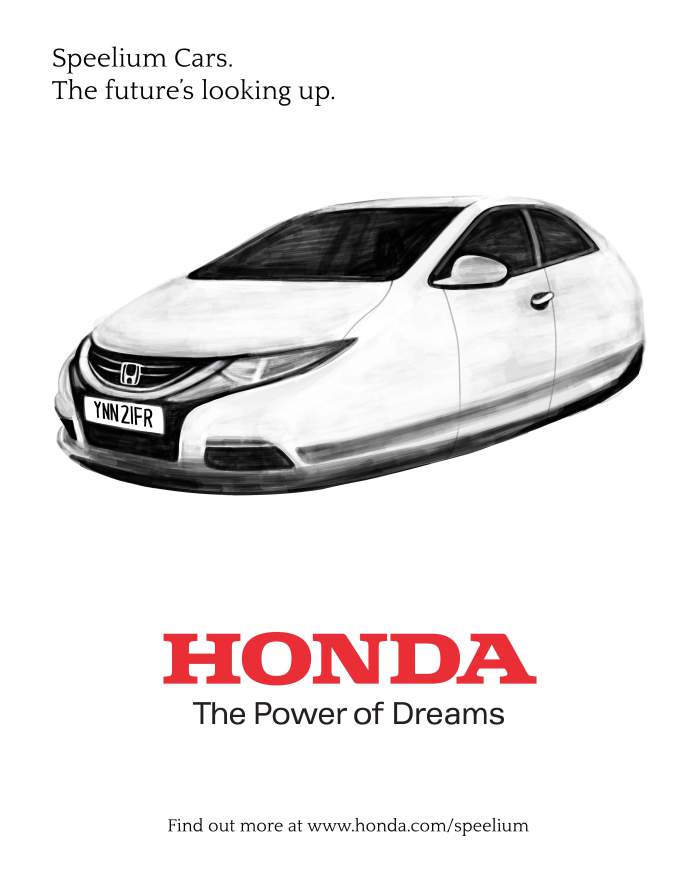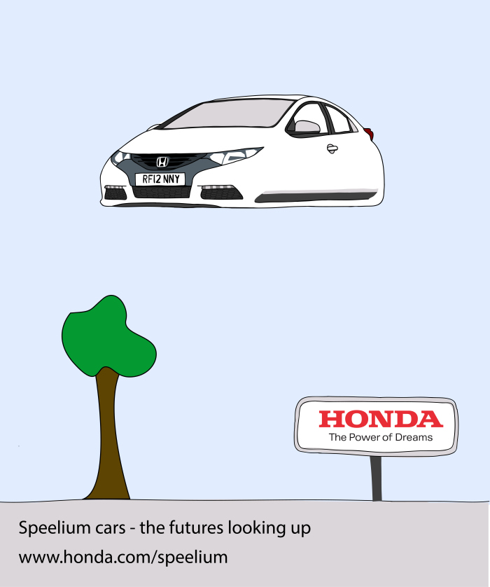 My latest project for my MA is exploring the idea of the handmade aesthetic in advertising and branding. As just an initial experiment before the project really began, I created these as an advert for Honda. Speelium of course isn’t real, but the idea is that it ignites the imagination of the viewer, getting them to think about how amazing Speelium cars would be. And the whole time they are thinking how liberating, ingenius, and innovative it is, they are picturing the Honda Civic. Simple but effective? Maybe. As I said these are just initial concepts of how the handmade aesthetic could be used in car advertising, as the present style of adverts are the polar opposite – they are chic, sleek, and engineered to perfection. Is it possible to create an effective car advert that plays on the nostalgic appeal of the handmade? I’ll keep you posted.