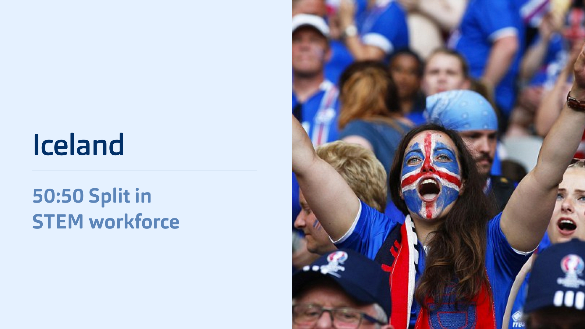 Iceland for example have managed to achieve a 50:50 split in their STEM (Science, Technology, Engineering and Mathematics) workforce. And there are similar figures starting to come out of the Eastern European states.
