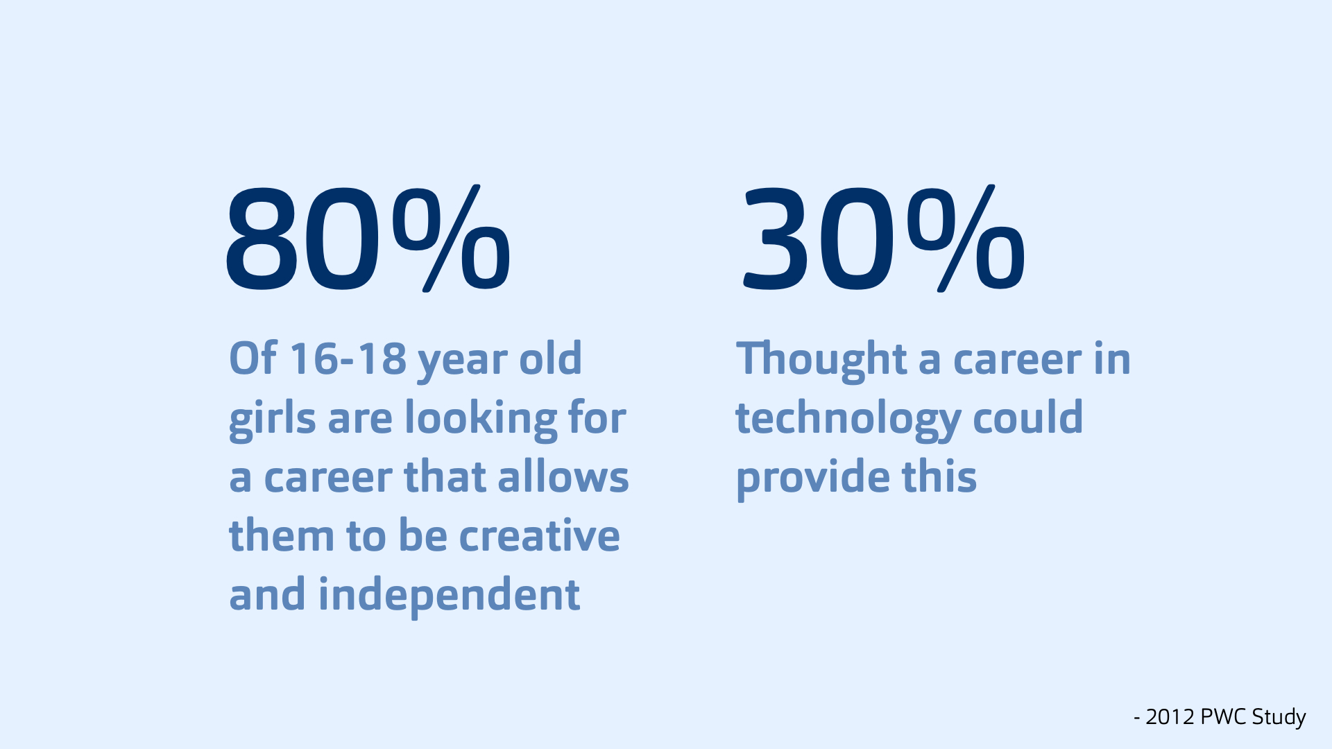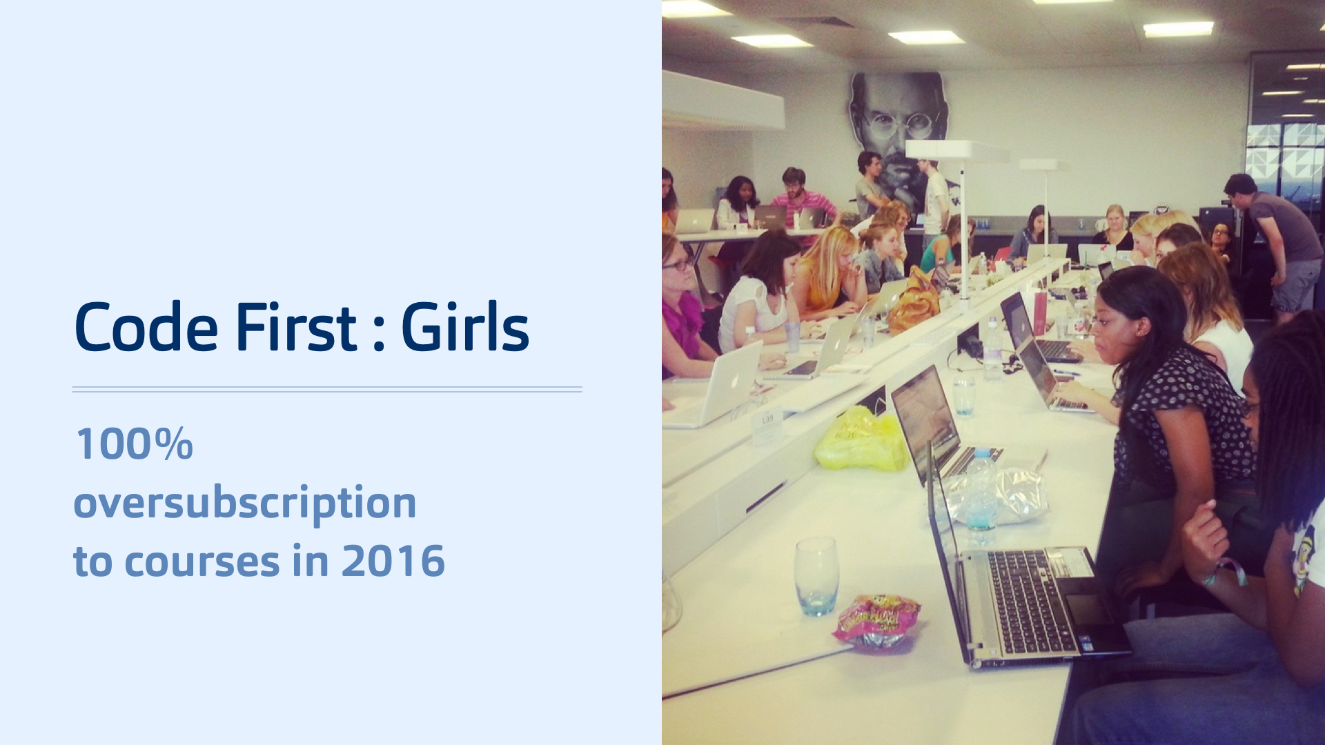 And when you look closer to home there’s also evidence that this is not the case. Code First : Girls is a fantastic scheme that provides free coding and programming training courses to girls and women across the UK. Last year they taught over 2,000 girls, and 100% of their courses were 100% over subscribed. There really is massive interest in these courses. So when considering things on a bigger scale, it is clear that this is not a fair assumption.