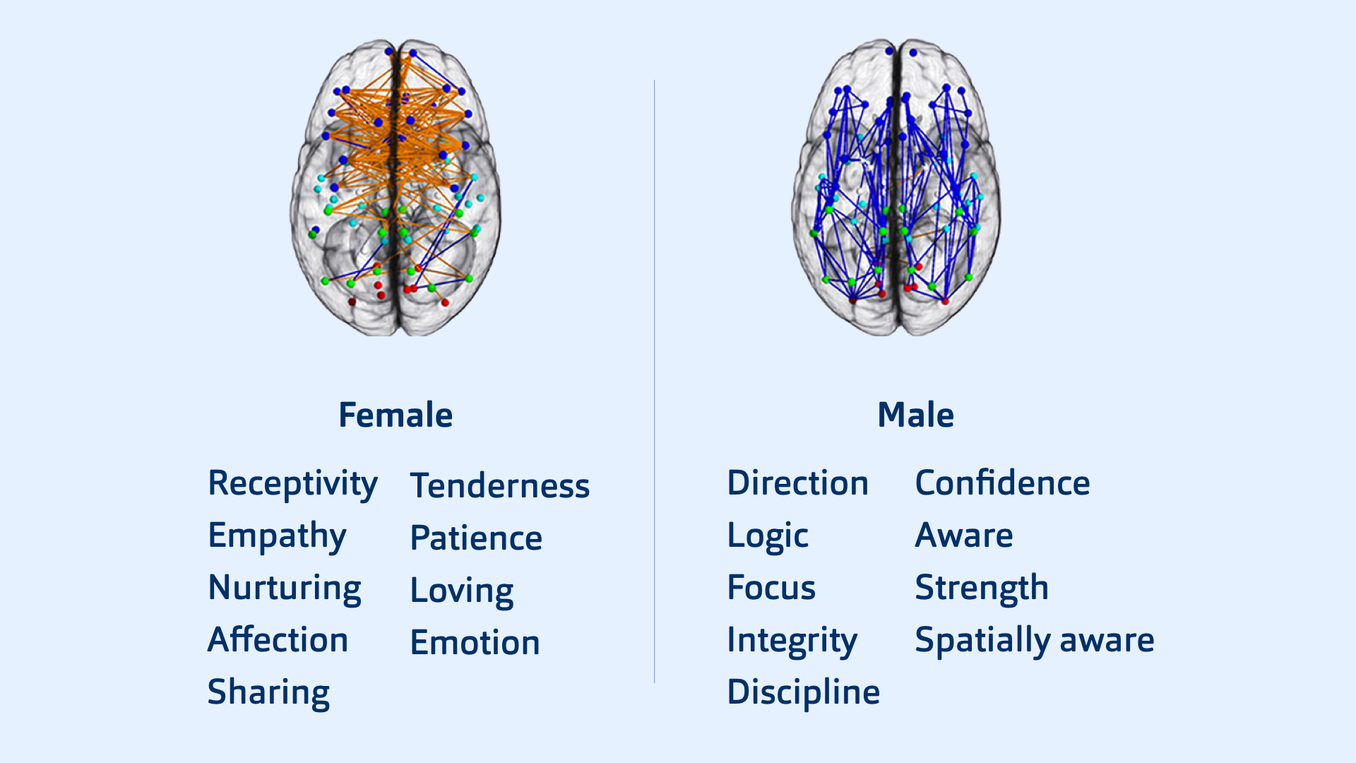 The common traits for the female brain is to be better at social skills – they are more empathetic, caring, loving and emotional. This makes them more attracted to things like teaching, medicine and care work. The male brain however is more focused, confident, and stronger, and better at spacial awareness, which makes them more suited to leadership roles. Except when you go through the traits of the male and female brain, how many of you exclusively relate to either of the columns? Probably not very many of you, and the latest research supports this.