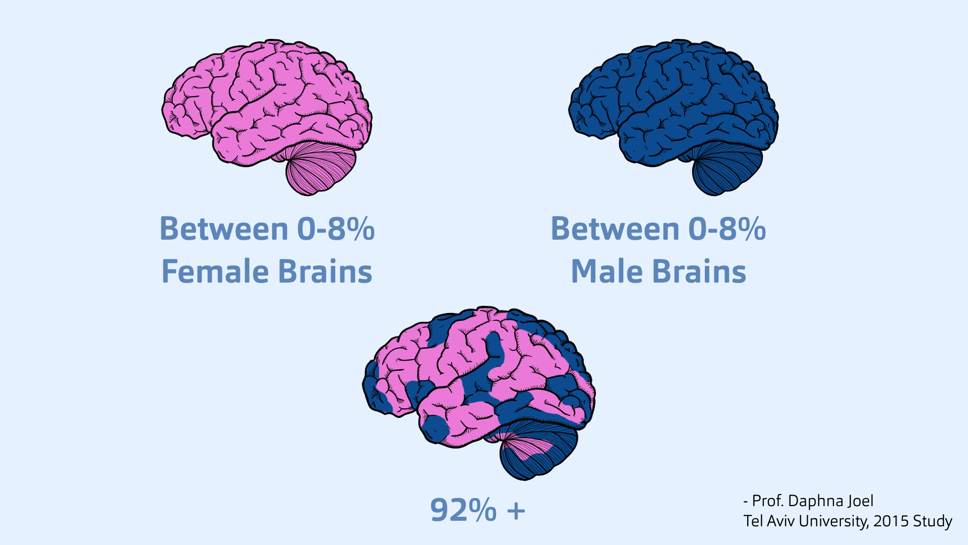 A 2015 study coming out of the University of Tel Aviv shows that actually only 0-8% of us exclusively relate to the characteristics of the male of female brain – the over whelming majority of us are a complete mix-match of the two brains, a bit like a mosaic. Put simply, “there are no two types of brain”.