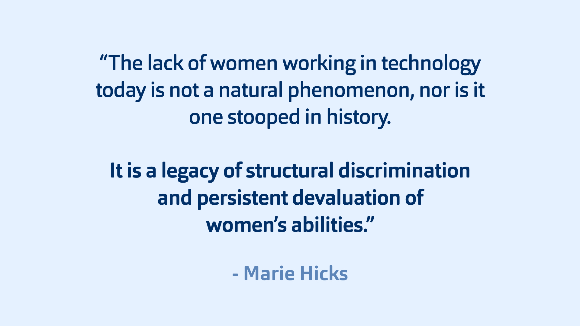 But the war came to an end, and this enormous pool of technology expertise was marched back in to the home. All of the top jobs in technology became completely reserved for me – women were not even able to apply for these jobs. The only jobs in computing that were really open to women were the machine operator, and card puncher. These were extremely unpopular jobs – the work itself was boring and monotonous, and in noisy, clammy, uncomfortable environments. These were not long term career prospects for women – no one wanted to do it for more than a few years. But the problem was, after a few years in the job, there was no where else for the women to go if they wanted to stay in computing. There were active policies in place to prevent them from getting promoted within the industry, or even getting transferred to other departments. Even just getting promoted to a supervisor level was seen to be taking a job away from a man, so had to be avoided at all costs.