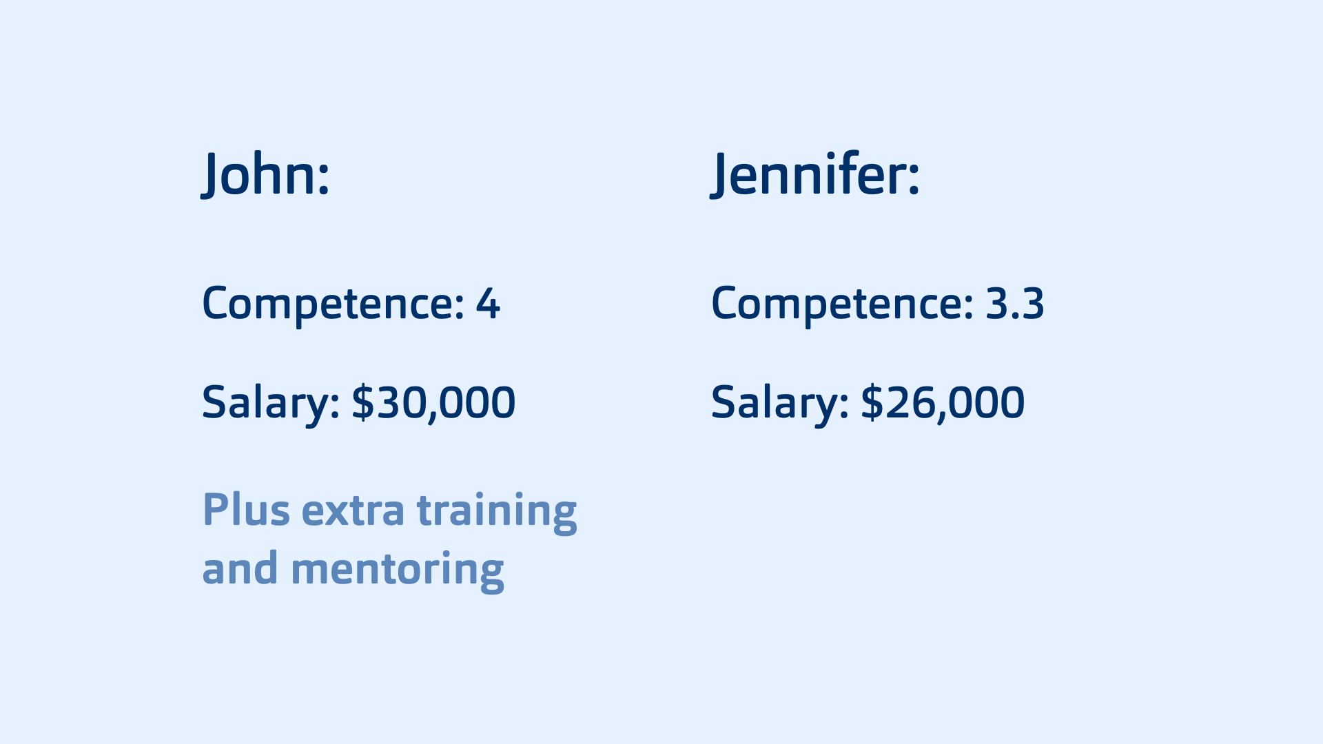 For example in 2012 a research study sent out two identical CVs to a group of laboratory scientists. The CVs were identical, except at the top of one of them it said ‘John’ and at the top of the other one it said ‘Jennifer’. The scientists were then asked to rate the candidates for competence, and recommend them a starting salary. The results were as follows…