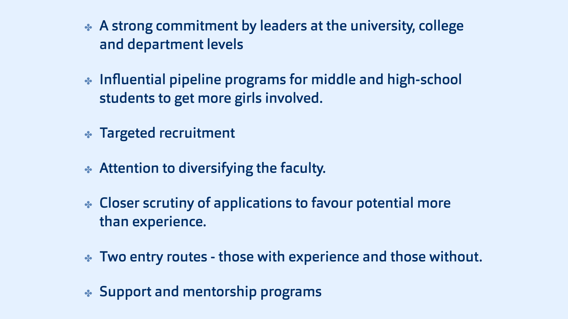 The key here is supporting and encouraging the girls that don’t have much experience (the pre-requisite for most CS courses is only an A Level or equivalent in Mathematics), but do show all the right potential of good maths and problem solving skills. If coached correctly these young women will pick up the programming knowledge they need to in no time, and catch up (if not overtake) the boys who have been tinkering and hacking with code for years. And when you go through all of this advice, its clear that it’s just as relevant to employers as it is educators.